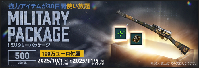 - ・ミリタリーパッケージは新登場時、再登場時に交換カウントがリセットされますので前回のミリタリーパッケージを交換された方でも再度交換することが可能です。