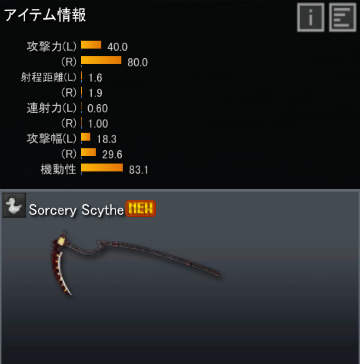 ▼近接武器「Sorcery Scythe」のアイテム情報