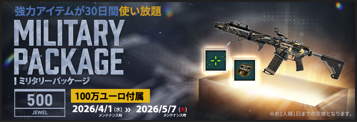 | キャンペーン | 【4/1〜5/7】「ミリタリーパッケージ」更新! 今回は「Anubis」シリーズ銃器が期間限定で登場! |